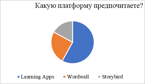 Для оценки эффективности цифровых интерактивных инструментов нами был проведен опрос среди учеников 8-х и 9-х классов. Всего в опросе приняли участие 135 человек. На вопрос о предпочтении определенной платформы большинство учеников выбрали LearningApps (58 %), четверть их них отдают предпочтение Wordwall, а за Storybird проголосовали 17 %.